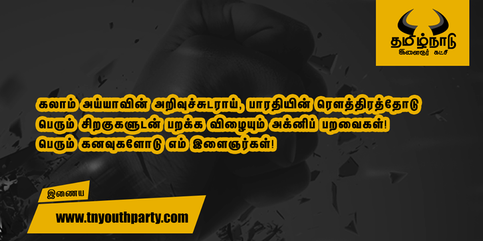 நெஞ்சுரைக்கும் வீரமும், மண்டியிடாத மானமும், விவசாயத்தை விஞ்ஞானத்தின் வளர்ச்சியோடு சமமாக வளர்க்கும் உத்தியும், அறிவியலில் புதியதோர் புரட்சியும் செய்யக்கூடிய ஆற்றலும் இளைஞர்களிடம் உள்ளது என்பதை நம் முன்னோர்கள் கணித்து இளைஞர்களே இந்த நாட்டின் வளர்ச்சியை வழிநடத்தும் சக்தி என்று குறிப்பிட்டுள்ளனர். அந்தக் கூற்றினை நாம் நிறைவேற்றவே இங்கு களம் காண்கின்றோம். நம் முன்னோர்கள் கூறியது பொய்யாகவில்லை என்பதற்கு எடுத்துக்காட்டாக நடைபெற்றது தான் இந்த ஜல்லிக்கட்டு புரட்சி. அந்த ஜல்லிக்கட்டு புரட்சியில் உருவானதே நம் தமிழ்நாடு இளைஞர் கட்சி.